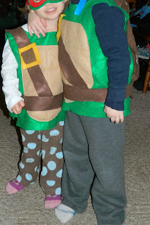 Grant won't hardly take his costume off and he and Sophie ran around my mom's house like ninja turtles when I put them both in the costumes. So score one for mom!